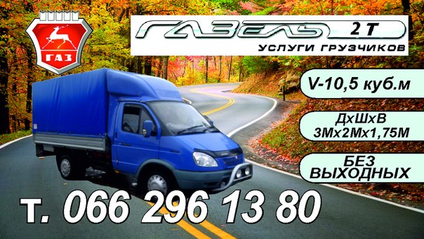 Цена работы автомобиля грн.: за час 80 грн грн., за км* 4.00 грн грн.. Погрузка: грузоподъемность 2 тонн, кол. кубов 10.5 м3, длина 3 м, ширина 2 м, высота 1.75 м, верхняя, задняя, постоянно, ежедневно, круглосуточно. Условия: GPS. Цена работы грузчика грн.: за час 50 грн грн., за этаж*** 10 грн грн..